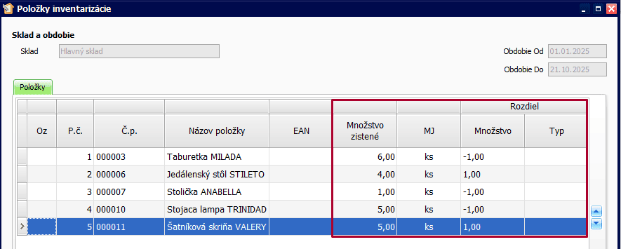 - V druhom kroku zadajte zistený stav položiek, vygenerujte manká alebo prebytky.