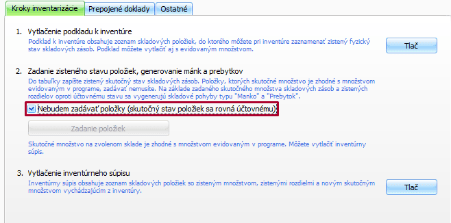 - Ak po vykonaní fyzickej inventúry v sklade zistíte, že skutočný stav všetkých položiek súhlasí s účtovným stavom v programe, nemusíte položky zadávať ručne. Zvoľte možnosť Nebudem zadávať položky (skutočný stav položiek sa rovná účtovnému).