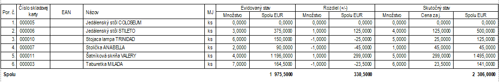 - V poslednom kroku Vytlačte inventúrny súpis, ktorý obsahuje zoznam položiek so skutočným stavom, účtovným stavom a ich rozdiel. Tlač je možná iba v prípade, ak sú vytvorené všetky predchádzajúce kroky inventarizácie, t. j. sú vygenerované manká a prebytky,