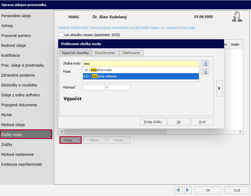 - v poli Zložka mzdy zadáte kód alebo názov zložky mzdy a program ich vyhľadá všetky podľa textu.