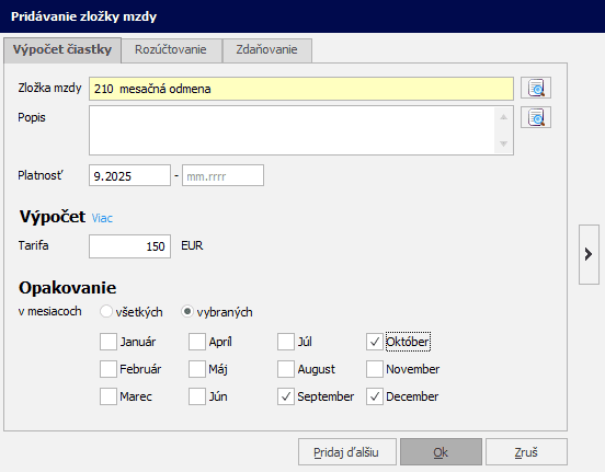 Vyberiete Vami požadovanú zložku mzdy, doplníte obdobia platnosti a tarifu. Doplňujúce údaje sa dajú zobraziť resp. skryť cez polia Viac alebo Menej. Opakovanie zvolíte buď vo všetkých mesiacoch alebo vo vybraných. Konkrétne dni môžete vyklikávať v kalendári len priamo v mzde.