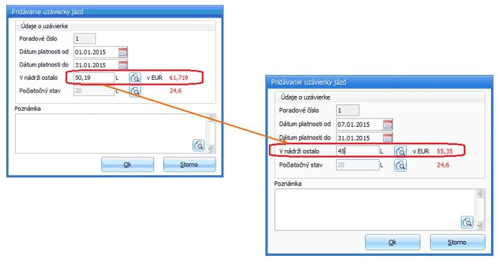 - V nádrži ostalo: po kliknutí na lupu, program automaticky doplní stav v litroch (aký by mal byť stav nádrže podľa normovanej spotreby) – túto program počíta:
