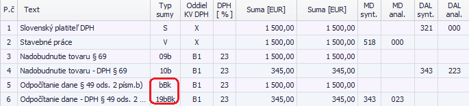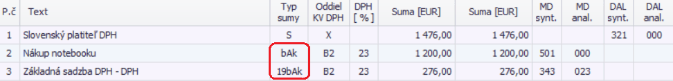 - má nárok na odpočítanie celej DPH z nadobudnutých tovarov a služieb – pri účtovaní použije typy súm bez dodatkov „k“ a „n“.