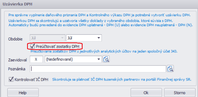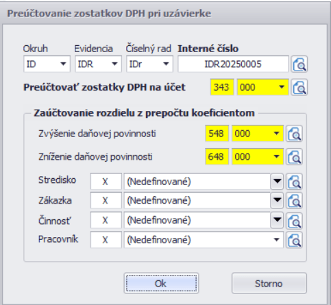 Prepočet odpočtu DPH koeficientom v každom zdaňovacom období (mesiac, štvrťrok) program vykoná automaticky pri uzávierke DPH, ak je zapnutá voľba Preúčtovať zostatky DPH.
