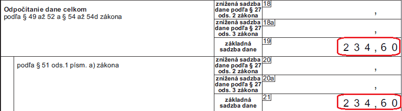 DP DPH: odpočítane dane v pomernej časti bude v riadkoch 19 a 21 (0,85*276 eur), v prípade zníženej sadzby dane 19% v riadkoch 18 a 20 a v prípade zníženej 2 sadzby dane 5% v riadkoch 18a a 20a.