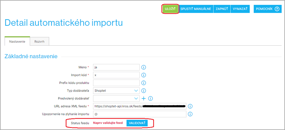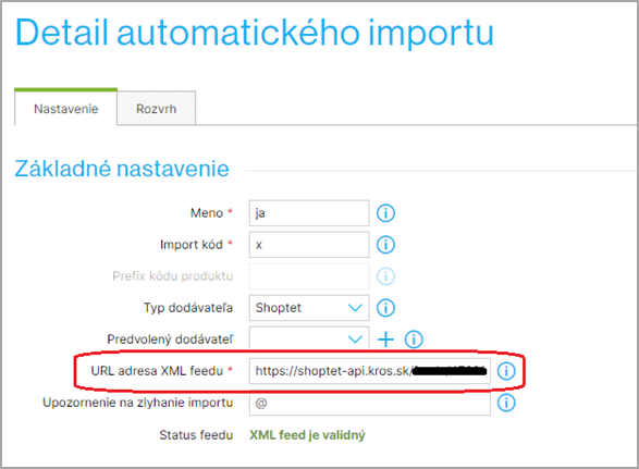 V časti Základné nastavenia je potrebné skontrolovať pole URL adresa XML feedu. Vyplnená URL adresa by mala začínať presne týmto textom: https://shoptet-api.kros.sk/feeds/. Dôležité v adrese je práve slovo kros.