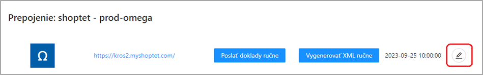 Prejdite na stránku https://shoptet.kros.sk/#/ a prihláste sa vašimi prihlasovacími údajmi. Následne otvorte editáciu vášho prepojenia kliknutím na ikonku ceruzky.