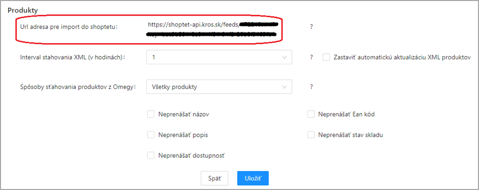 Nižšie, v časti Produkty, nájdite pole Url adresa pre import do shoptetu a uvedenú URL adresu skopírujte.