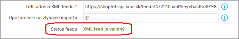 Po validácii XML feedu je váš automatický import uložený. Status feedu by mal byť zelený s informáciou, že XML feed je validný.