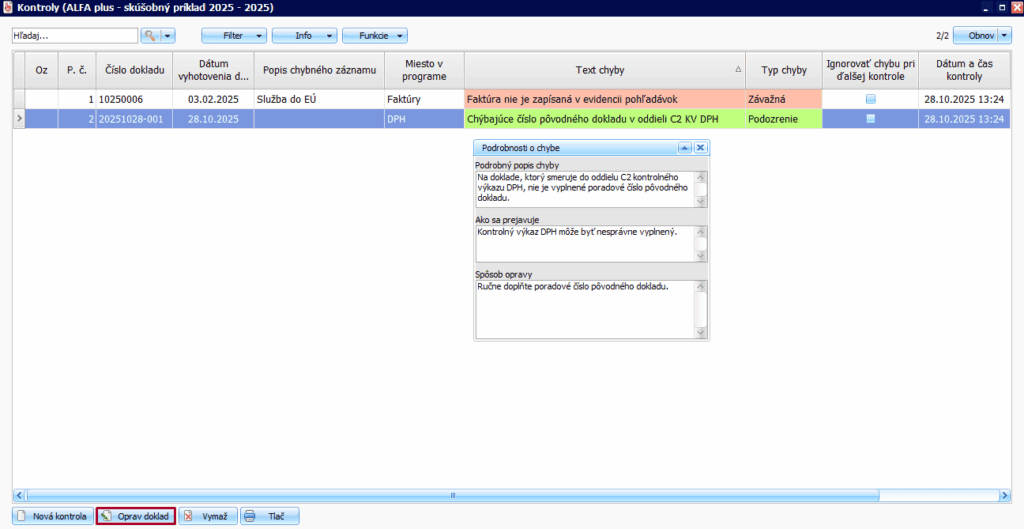 Kontrola v programe má za úlohu odhaliť chyby technického charakteru, previazanosti dokladov na evidencie, logickej nadväznosti a iné podobné druhy chýb.