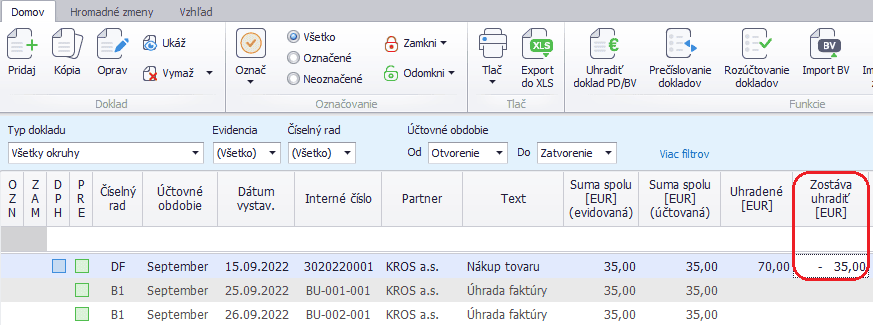 Po zaúčtovaní dokladov vykonáme kontrolu vysporiadania preplatenej došlej faktúry v časti Evidencia účtovných dokladov a Saldokonte po položkách.