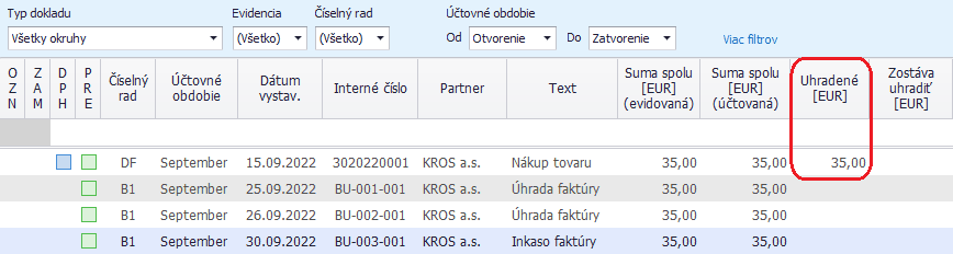 V Evidencii účtovných dokladov je faktúra uhradená v celkovej výške.