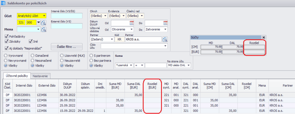 V Saldokonte po položkách bude faktúra evidovaná ako vyrovnaná. V stĺpci rozdiel nebude zobrazená žiadna hodnota.