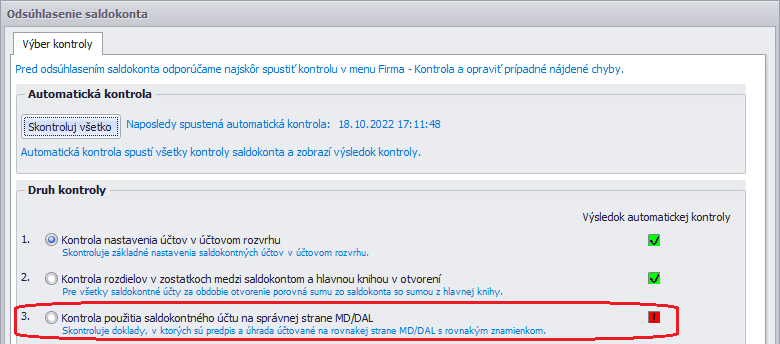 V súvislosti s mylnou platbou, program zobrazí po spustení funkcie Odsúhlasenie saldokonta chybu v kontrole číslo 3 – Kontrola používania saldokontného účtu na správnej strane MD/DAL. V tomto prípade môžeme potvrdiť možnosť Nevykazovať.