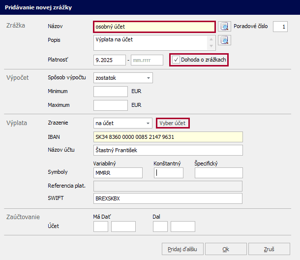 V takom prípade je potrebné pridať zrážku osobný účet v evidencii Personalistika na karte Zrážky cez voľbu Pridaj. Do poľa Názov napíšete osobný účet alebo zrážku vyhľadáte cez lupu na konci riadku. Nastavíte Platnosť, od ktorého mesiaca má byť zrážka použitá. Ak chcete tlačiť Dohodu o zrážkach, je potrebné túto voľbu označiť. Dokument nájdete cez (Tlač – Tlač – Personalistika – Písomné dokumenty pracovníkov – Dohoda o zrážkach zo mzdy).