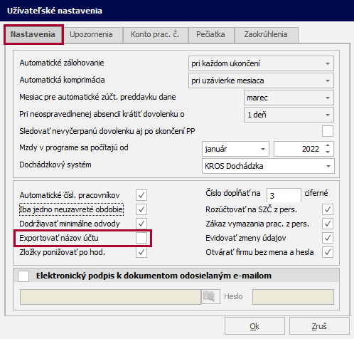 Pokiaľ nechcete do prevodných príkazov exportovať názov osobných účtov zamestnancov, odznačíte voľbu cez Natavenia – Nastavenia – Exportovať názov účtu.