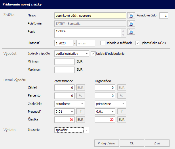 Od verzie 23.30 pribudla na zrážke doplnkové dôch. sporenie nová voľba – Uplatniť oslobodenie. Ak voľbu označíte, príspevok zamestnávateľa nebude podliehať zdaneniu a odvodom na zdravotné poistenie do výšky maximálne 500 eur ročne. Program túto maximálnu sumu sleduje automaticky po označení voľby, preddavok na daň a odvody na zdravotné poistenie vypočíta až zo sumy nad 500 eur..