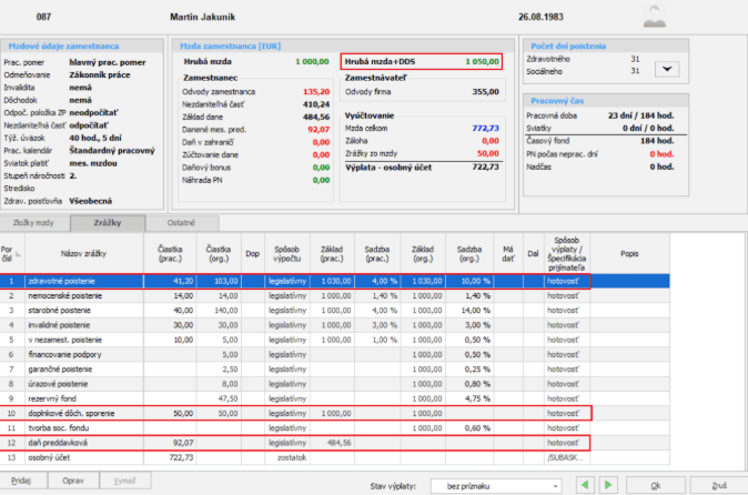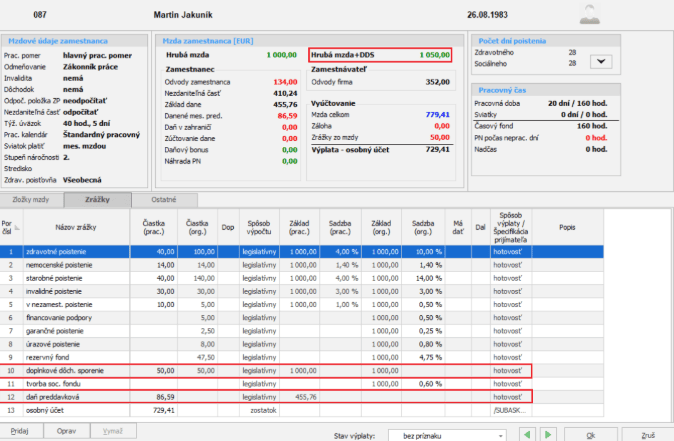 V záložke zrážky má zamestnanec pridané doplnkové dôchodkové sporenie kde mu zamestnávateľ prispieva sumou 50 eur a uplatňuje oslobodenie. Odvody na zdravotné poistenie sú vypočítané z vymeriavacieho základu, ktorý zodpovedá dosiahnutej mzde zamestnanca, teda z 1000 eur. Taktiež aj daň je vypočítaná z hrubej mzdy 1000 eur (1000 eur – odvody zamestnanca 134 eur – NČZD 410,24 eur = 455,76 eur, z toho daň 19 % = 86,59 eur).