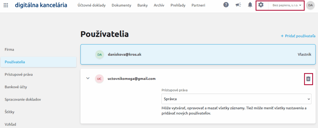 Existujúceho používateľa vymažeme v aplikácii cez Nastavenia (ozubené koliesko) v zozname používateľov kliknutím na ikonu koša pri danom používateľovi. Vymazať môžeme všetkých používateľov okrem Vlastníka.