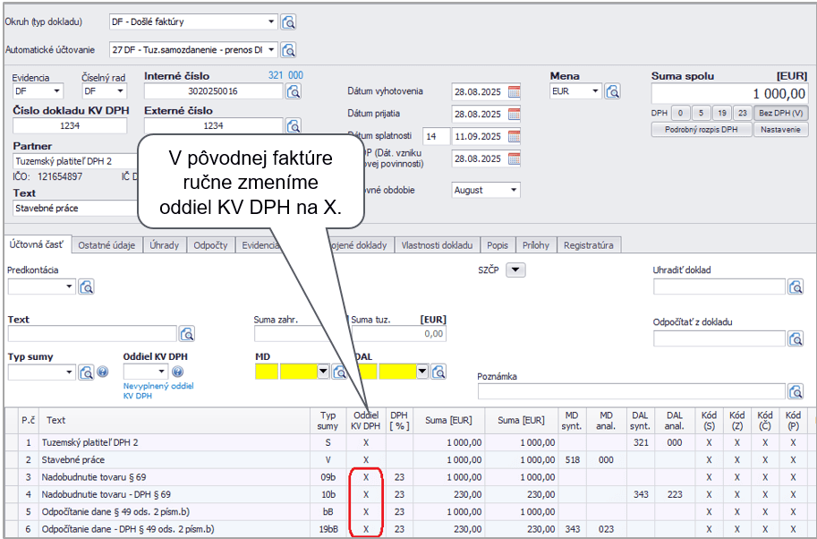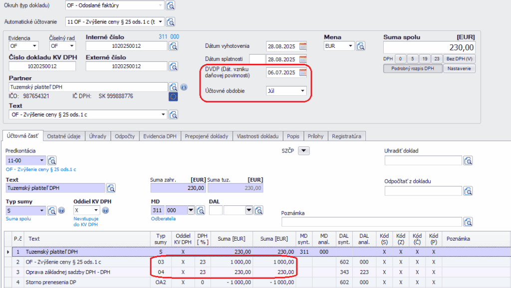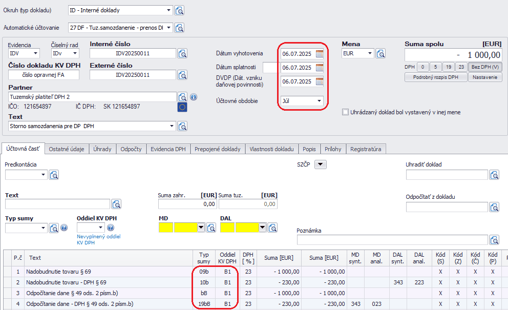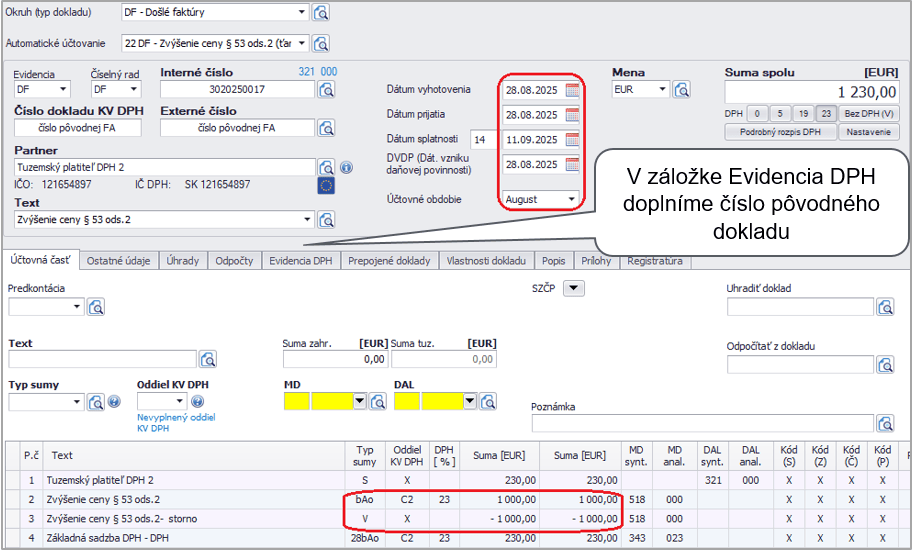 Pre dodatočný KV DPH je potrebné opraviť pôvodnú faktúru so samozdanením tak, že len opätovne do nej vstúpime a vymažeme oddiel KV DPH. Je to z dôvodu, aby program mohol automaticky uviesť do KV DPH kód opravy 1.
