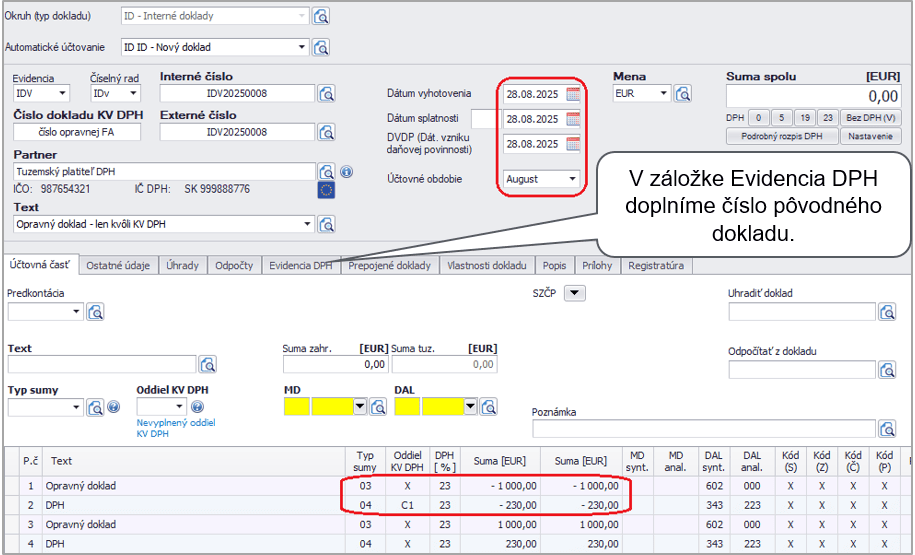Hodnotu DPH z opravnej faktúry uvedieme v časti C1 v zdaňovacom období, kedy sa opravný doklad (ťarchopis) vyhotovil, v programe pomocou interného dokladu. Základ dane a DPH uvedieme raz plusom a raz mínusom, čím si zabezpečíme, že sa oprava zobrazí len v KV DPH a nie v daňovom priznaní.