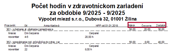 Počet hodín nároku, čerpania a zostatku lekára a sprievod rodinného príslušníka u jednotlivých zamestnancov si môžete pozrieť na dokumente cez Tlač – Tlač – Evidencia pracovnej doby – Počet hodín v zdravotníckom zariadení.