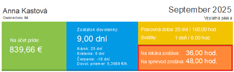 Zostatok na lekára a sprievod je zobrazený na výplatnej páske – farebný formát (Tlač – Tlač – Mzdy – výplaty a zálohy – Výplatné pásky).