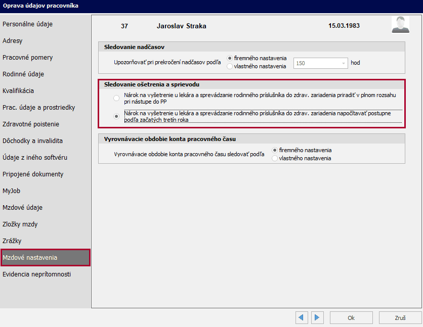 V programe OLYMP viete nastaviť priznávanie nároku na vyšetrenie u lekára a sprievod podľa začatých tretín alebo v plnom rozsahu v Personalistike zamestnanca na záložke Mzdové nastavenia.