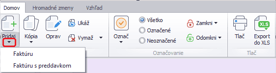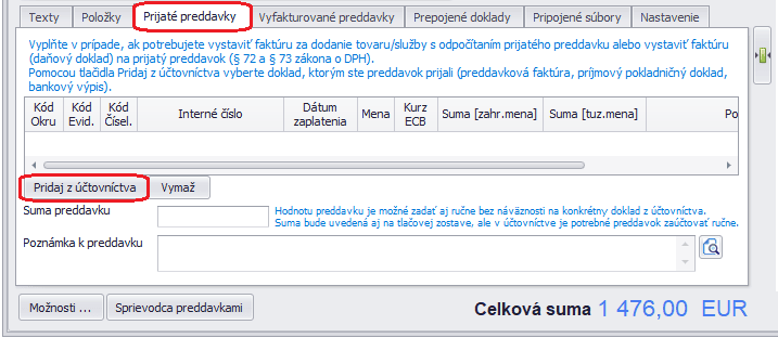 Pre evidovanie faktúr s preddavkom je možné využiť aj sprievodcu preddavkami. Nachádza sa vo Fakturácii – Odoslané faktúry (šípka pod voľbou Pridaj) prípadne priamo na faktúre v spodnej časti dokladu