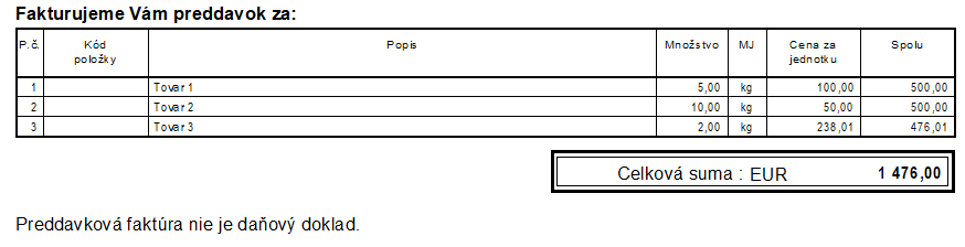 V menu Fakturácia – Odoslané preddavkové faktúry vystavíme preddavkovú faktúru. V tlači sa takáto preddavková faktúra zobrazí bez rozpisu DPH v celkovej sume.
