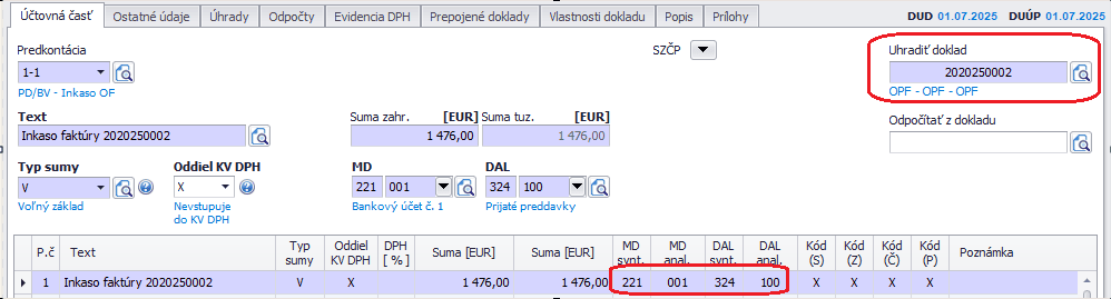 Po zápise do Evidencie účtovných dokladov (okruh OPF) je preddavková faktúra bez rozúčtovania, je len evidovaná. Hodnotu preddavku zaúčtujeme na účet 324.100 až zaevidovaním úhrady cez banku/pokladňu pomocou automatického účtovania 1 – PD/BV – Inkaso OF, DD.