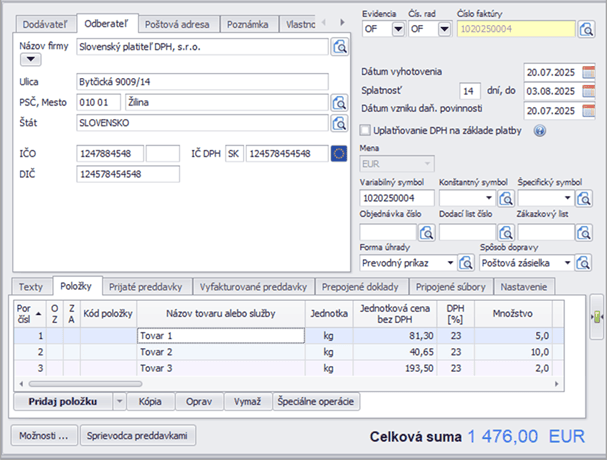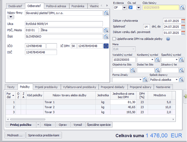 OF vystavíme v menu Fakturácia – Odoslané faktúry. Do faktúry pridáme všetky položky, ktoré zákazníkovi fakturujeme (môžeme ju vytvoriť kópiou z OPF).