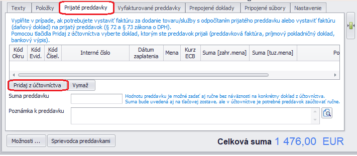 Pokračujeme v záložke Prijaté preddavky, kde pomocou tlačidla Pridaj z účtovníctva pridáme zaplatenú OPF, ktorá sa bude odpočítavať.