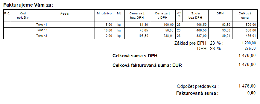 Odpočet preddavku sa následne zobrazí v tlačových zostavách. Ak je faktúra na rovnakú sumu, ako zaplatený preddavok, k úhrade zostane 0.