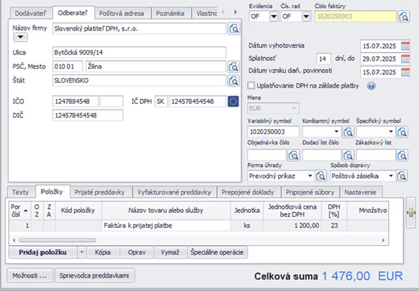 Vytvoríme ju cez menu Fakturácia – Odoslané faktúry. Pridáme len jednu položku s názvom napr. Faktúra k prijatej platbe (ako voľnú položku) v celkovej výške prijatého preddavku.