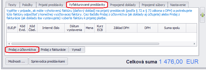 V záložke Vyfakturované preddavky postupne pridáme všetky odoslané faktúry, ktoré boli vyhotovené k prijatým platbám, a to pomocou voľby Pridaj z účtovníctva alebo Pridaj z fakturácie. Zabezpečíme tak odpočet vyfakturovaného preddavku.