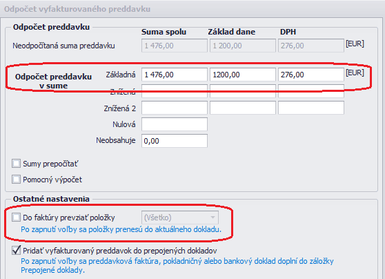 Voľbu Do faktúry prevziať položky necháme vypnutú (položka už bola pridaná ručne, došlo by k duplicite).