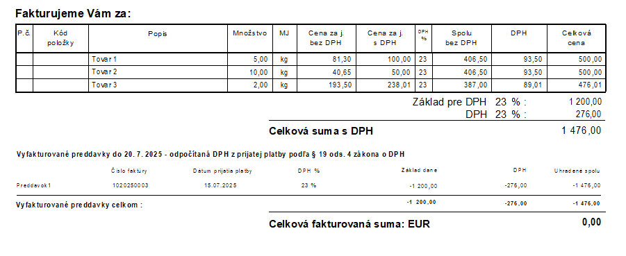 V tlačových zostavách pre odoslané faktúry (okrem zostavy Faktúra do zahraničia) vidíme v dolnej časti prehľad všetkých vyfakturovaných preddavkov: