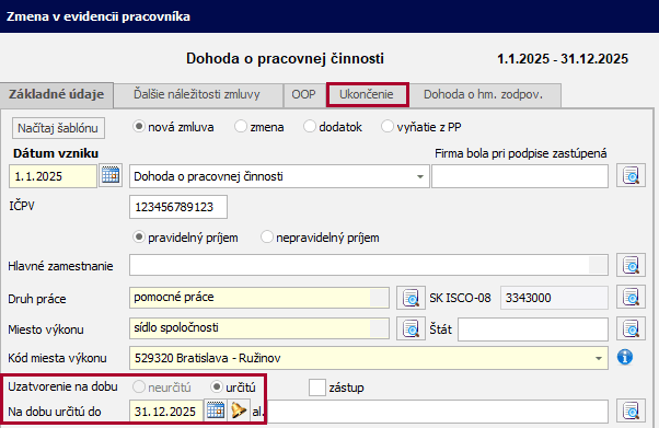 V Personalistike na karte Pracovné pomery zadáte dobu uzatvorenia dohody. Tento dátum program automaticky prenesie na záložku Ukončenie.