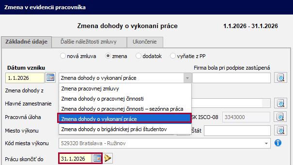 Zadáte dátum vzniku zmeny. Pre uľahčenie zadávania sa zobrazia pôvodné údaje, aby ste ich nemuseli prácne pridávať. Prepíšete len tie polia, ktoré sa menia oproti pôvodnej dohode. V našom prípade označíte, že sa predlžuje dohoda na ďalšiu dobu určitú.