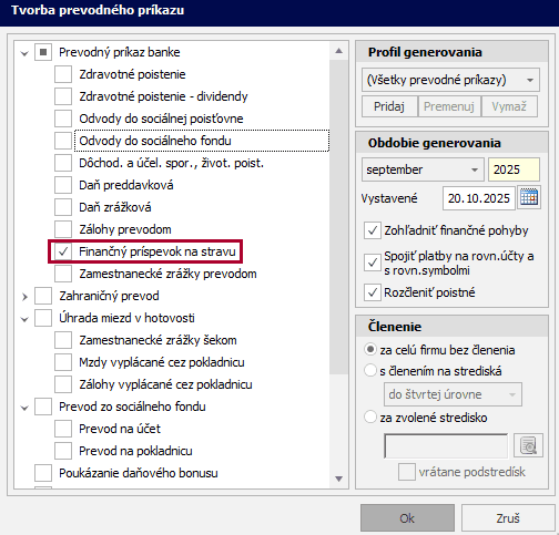 Vyplácate finančný príspevok zamestnancom prevodom k 1. dňu v mesiaci? Od verzie 21.50 môžete vygenerovať samostatne prevodný príkaz len na finančný príspevok na stravu.
