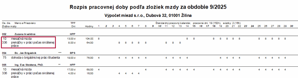 Dokument zobrazíte cez Tlač – Tlač – Evidencia pracovnej doby – Rozpis pracovnej doby – po zamestnancoch – Rozpis pracovnej doby podľa zložiek mzdy.