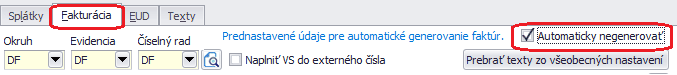 - V dolnej časti najskôr v záložke Fakturácia zapneme voľbu Automaticky negenerovať, pretože ide o záväzky, z ktorých sa budú generovať iba doklady do Evidencie účtovných dokladov.