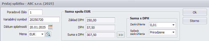 - V záložke Splátky pridáme prvú splátku. Po stlačení tlačidla Pridaj zadáme príslušné údaje – Variabilný symbol a Dátum splatnosti. V rozbaľovacom zozname Mena ponecháme „EUR“.