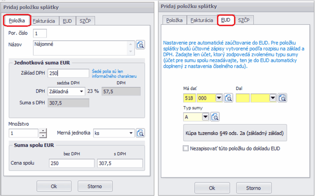 - V záložke Položky pridáme položky splátky. Sadzbu DPH zvolíme „Vyššia“. V záložke EUD môžeme nastaviť nákladový účet s príslušnou analytikou a Typ sumy ponecháme „A“.