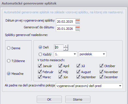 Dátum Generovať do dátumu nastavíme vyšší než je deň poslednej splátky. Pri takomto nastavení sa vygeneruje posledná splátka aj v prípade, že by padla na deň pracovného pokoja.