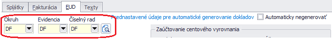 - Nakoniec v záložke EUD nastavíme Okruh, Evidenciu a Číselný rad pre zmluvné faktúry.