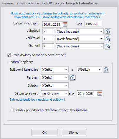 Pri automatickom generovaní dokladov musí byť nastavený okruh, evidencia a číselný rad zhodne s nastavením v karte splátok v splátkovom kalendári, príp. nastavený okruh na položku (Všetko).