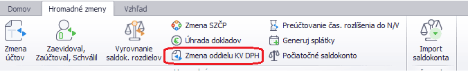 Vygenerované splátky nemajú vyplnený oddiel KV DPH. Po vygenerovaní môžeme doplniť oddiel KV DPH ručne na doklade alebo môžeme využiť hromadnú funkciu Zmena oddielu KV DPH.