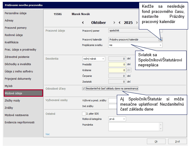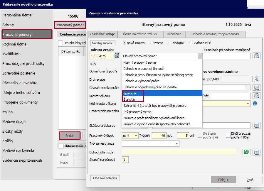 V OYLMPE na karte Pracovné pomery na záložke pracovný pomer cez Pridaj zvolíte ako pracovný pomer Spoločník alebo Štatutár. Túto evidenciu využijete iba v prípade, ak takýto „zamestnanec“ vykonáva svoju funkciu na základe zmluvy o výkone funkcie alebo mandátnej zmluvy.